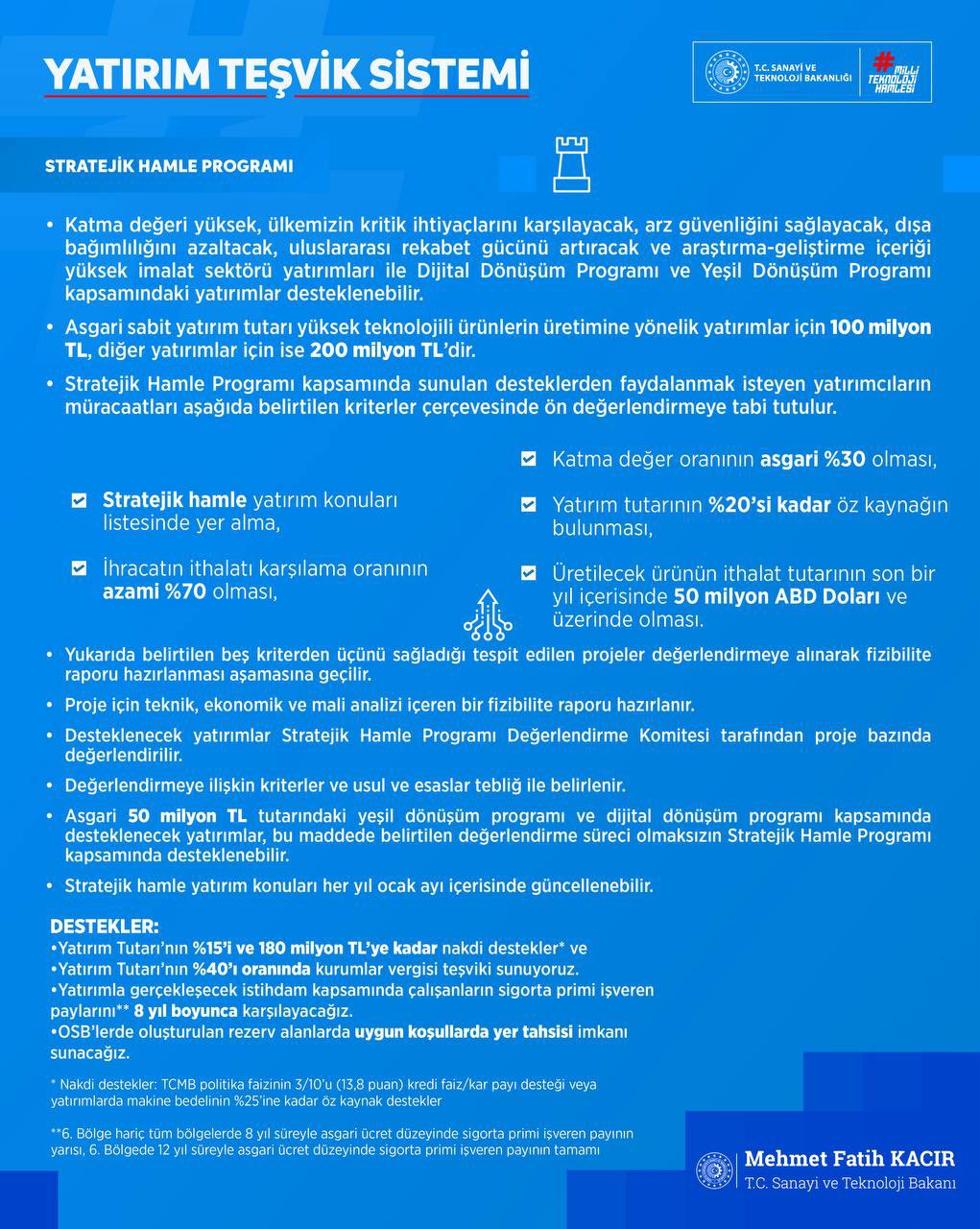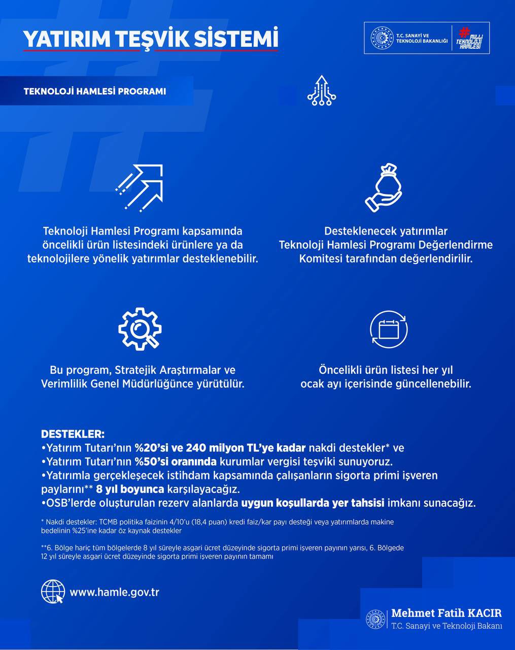 - Teknoloji Hamlesi kapsamında yatırım tutarının %20'si ve 240 milyon TL'ye kadar nakdi destekler sunuluyor.