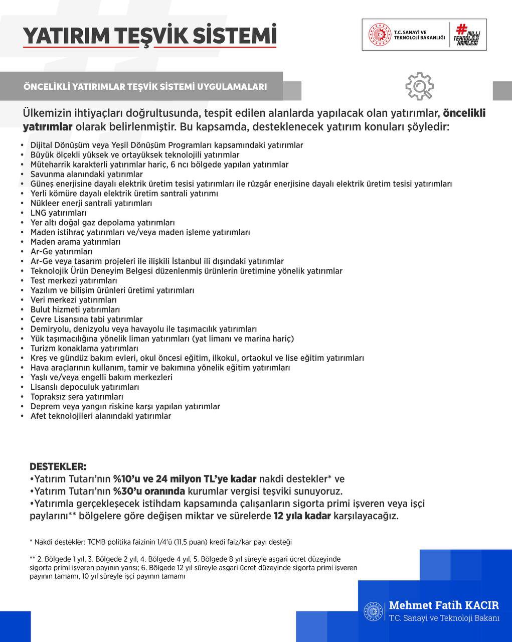 Yenilenebilir enerji, veri merkezleri, Ar-Ge’ye dayalı yatırımlar, demiryolu, denizyolu veya havayolu taşımacılığı, lisanslı depoculuk, topraksız sera, afet riskine karşı yatırımlar gibi belirlenmiş başlıklarda yapılan yatırımlar desteklenecek. Destekler, yatırım tutarının %10'u ve 24 milyon TL'ye kadar nakdi destekler ile %30 oranında kurumlar vergisi teşviki sunuyor.
