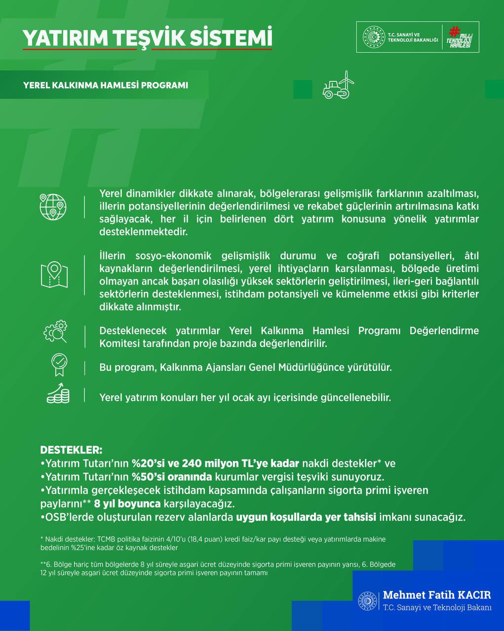 - Yerel Kalkınma Hamlesi de benzer nakdi ve vergi teşvikleri içerirken, sigorta primi işveren payları bölgelere göre değişmekle birlikte 8 yıl boyunca karşılanacak.