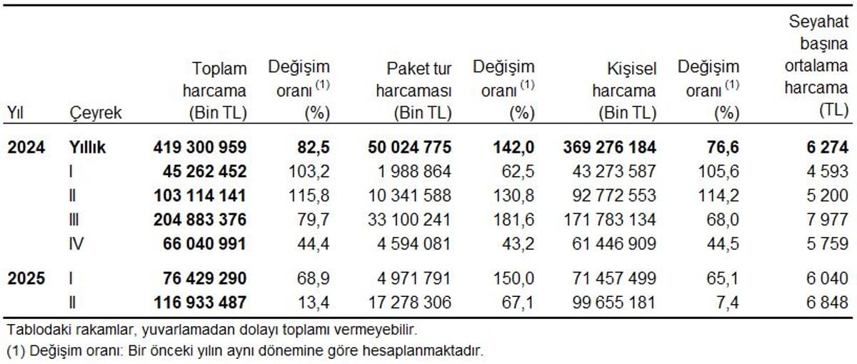 TÜİK verilerine göre, yurt içinde ikamet eden vatandaşların 2025 yılının Nisan-Haziran dönemindeki seyahat harcamaları geçen yılın aynı dönemine göre yüzde 13,4 artarak toplamda 116,9 milyar liraya ulaştı. Seyahat sayısı azalırken, seyahat başına düşen harcama tutarı yükseldi.