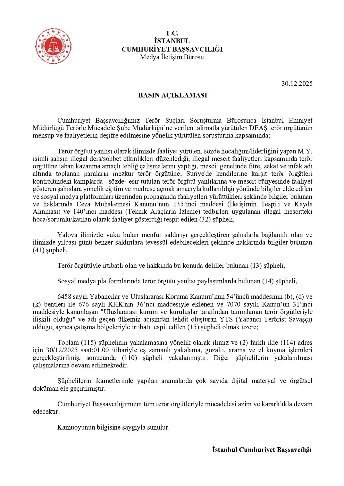 - DEAŞ ile bağlantılı toplam 115 şüpheli hakkında gözaltı kararı verildi.