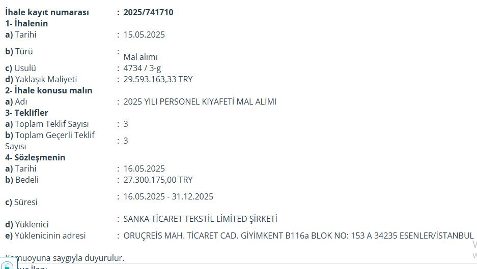 Üsküdar Belediyesi’ne bağlı iştirak şirketi Personel AŞ, 15 Mayıs 2025 tarihinde “2025 Yılı Personel Kıyafeti Mal Alımı” başlığıyla iki ayrı ihale düzenledi. Üç firmanın davet edildiği bu ihalelere Sanka Ticaret de katıldı.