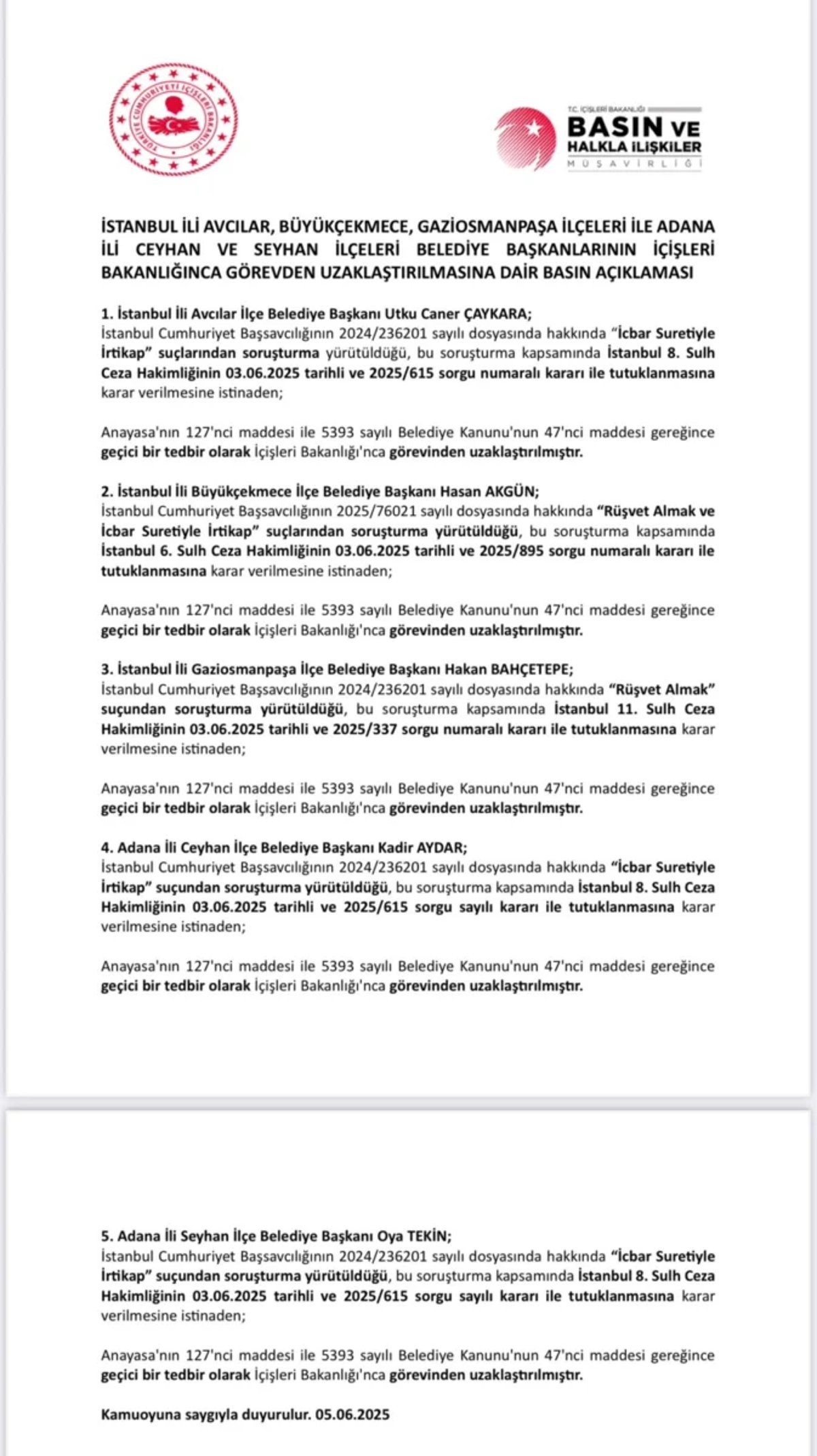 İçişleri Bakanlığı, İstanbul'dan üç, Adana'dan iki olmak üzere toplam beş CHP'li belediye başkanının görevden uzaklaştırıldığını duyurdu. Bu karar, ilgili başkanlar hakkındaki soruşturmalar ve tutuklama kararları sonrası alındı.