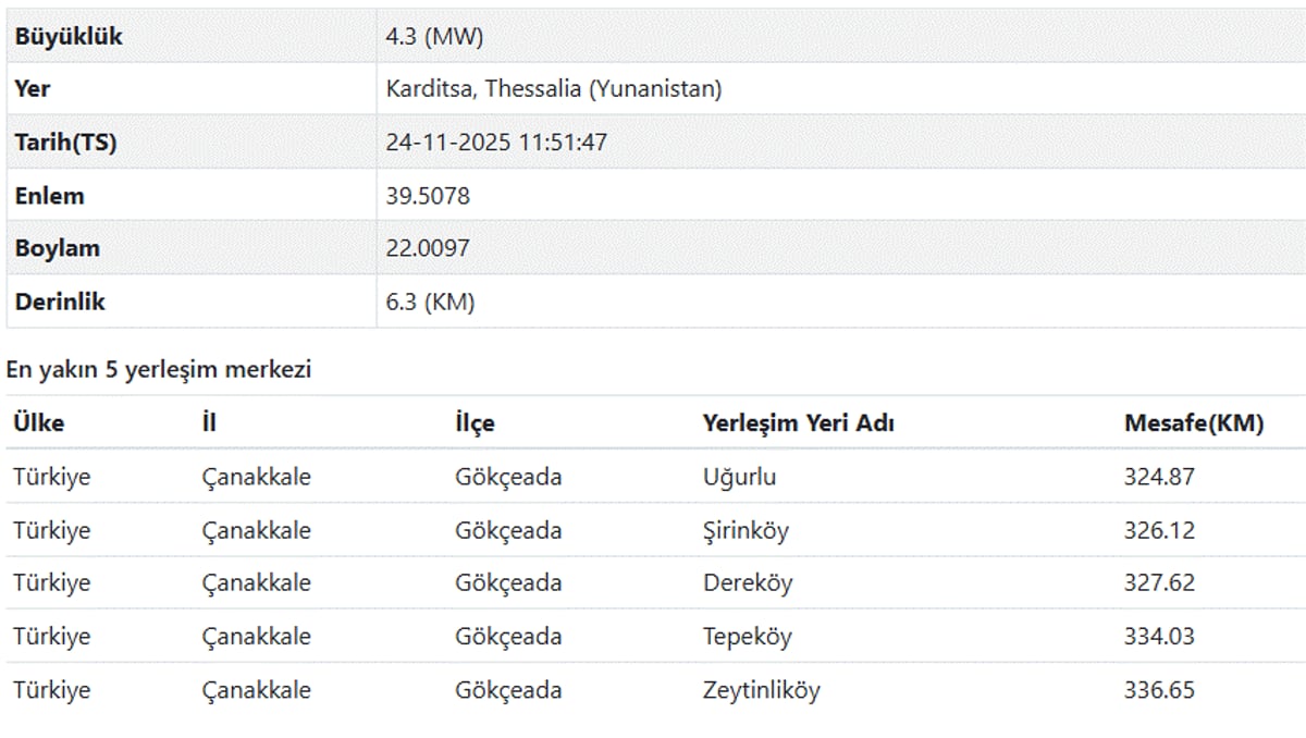AFAD tarafından duyurulan en son deprem verilerine göre Yunanistan Karditsa'da saat 11.51'de yerin 6.3 kilometre derinliğinde 4.3 şiddetinde bir deprem meydana geldi.