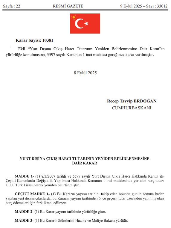 9 Eylül tarihli Resmi Gazete'de Cumhurbaşkanı Recep Tayyip Erdoğan imzalı kararla yurt dışına çıkış harcı güncellendi.