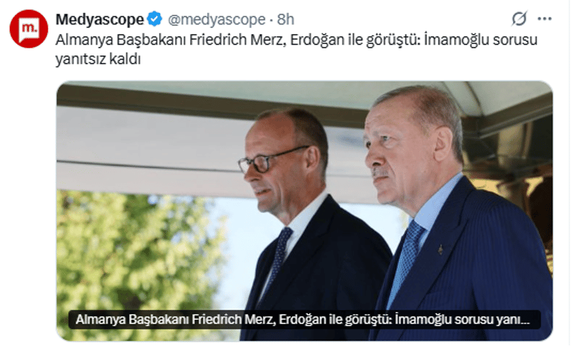 Ruşen Çakır’ın haber platformu bu ziyareti değerlendirirken başlık olarak ‘Merz, Erdoğan ile görüştü: İmamoğlu sorusu yanıtsız kaldı’ demeyi tercih etmiş.